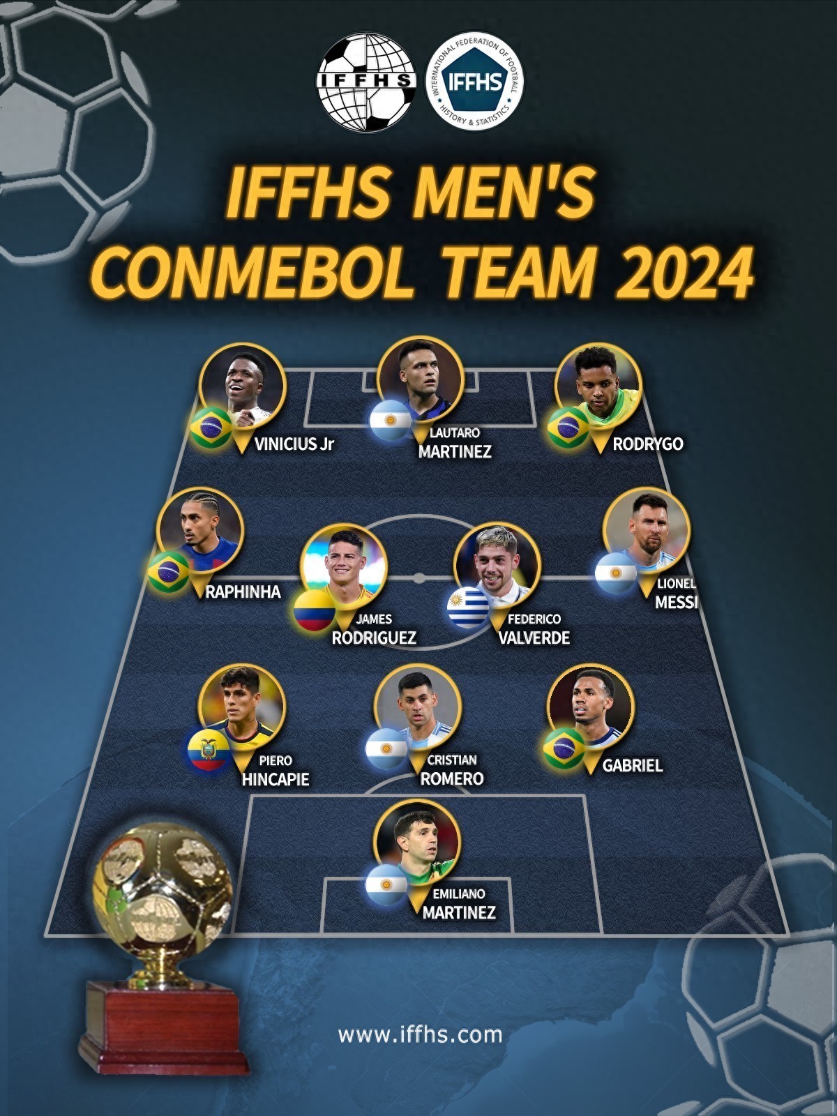 北京时间1月16日,IFFHS(国际足球历史和统计联合会)评选出了2024年度南美足联最佳阵容。